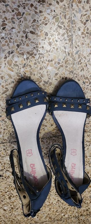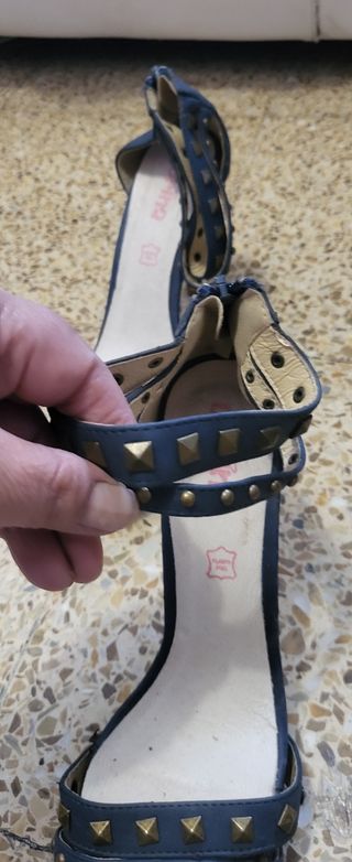 Elegantes zapatos de tacón, perfectos para eventos especiales. - Diseño de tiras cruzadas en color azul. - Zapato negro con pedrería - Zapatos negros con hebilla decorativa. - Talla 38. -10€ par
