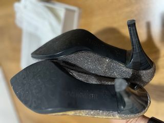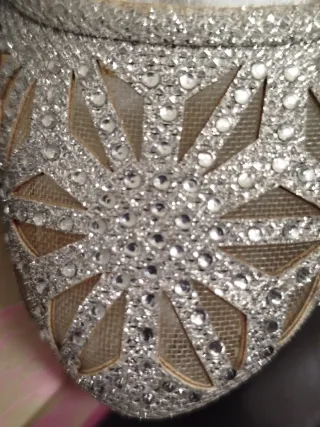 Zapato de tacón alto talla 37 plateado. Como podéis ver en las fotos están como nuevos, solo me los pude poner una vez, la suela está casi intacta. Han estado muy bien guardados. Incluso hay una bolsita que tiene brillantitos pequeños, por si se cae alguno con el uso, que los podáis reponer.
