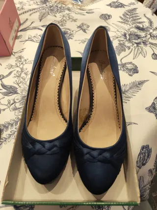 Elegantes zapatos de fiesta en color azul marino. Perfectos para ocasiones especiales. Solo se han utilizado en una ocasión para un evento. - Material satinado. - Diseño con detalle trenzado en la punta. - Adorno de puntilla en el interior.