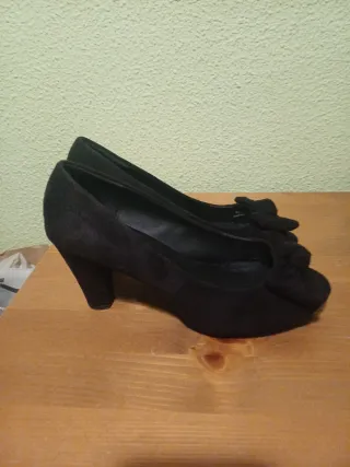 Elegantes zapatos de fiesta negros con un detalle de lazo. - Diseño peep toe. - Material exterior tipo ante. - Adorno de lazo en la puntera.