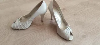 Elegantes zapatos de fiesta en color beige/perla. Satinados - Diseño de punta fina. - Tira de sujeción al tobillo. - Tacon de 6cm Muy cómodos Usados solo el dia de mi boda. Suela de cuero algo gastada. El tacón tiene refuerzo. 15€