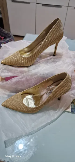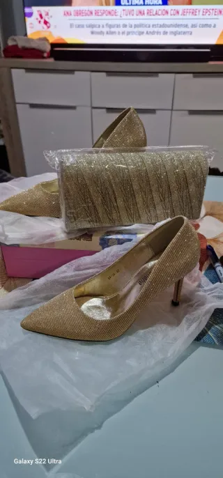 Elegantes zapatos de tacón para ocasiones especiales. - Diseño brillante en color dorado. - Tacón fino y punta afilada. - Acabado textil con destellos. - Bolso a juego. Usados en solo una ocasión. Zapatos 15€ Bolso 10€. Conjunto 20€