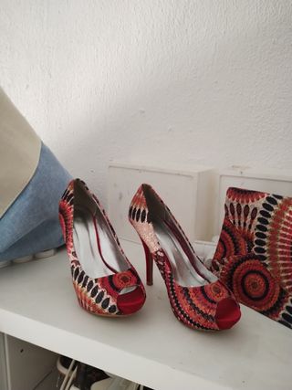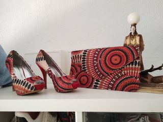 Preciosos zapatos de tacón y bolso de mano a juego, ideales para una ocasión especial. Son de color rojo con estampado étnico. - Zapatos de tacón alto peep-toe. - Bolso de mano tipo sobre. - Estampado llamativo y colorido. - Perfectos para eventos elegantes.
