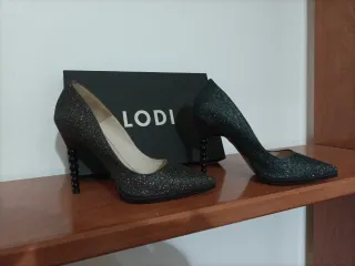 Elegantes zapatos de tacón Lodi, perfectos para eventos especiales. Usados una sola vez. - Diseño brillante en negro, morado, verde oscuro. - Tacón con detalle de perlas. - Talla 37.