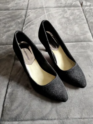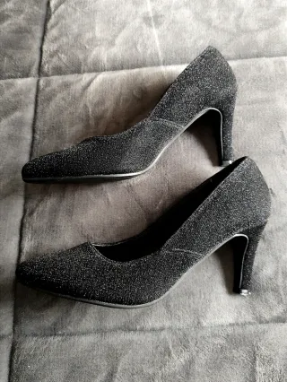 Sandalias negras de tacón con un acabado brillante, como purpurina. Número 38 en muy buen estado. Medidas en fotos.