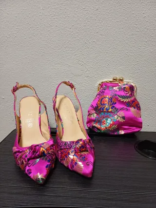 Conjunto de zapatos de tacón y bolso de mano a juego, con un vibrante estampado floral. Usados solo una vez, para una boda. - Zapatos de tacón slingback con detalle de lazo. - Bolso de mano tipo cartera con cierre de boquilla. - Diseño con motivos florales en tonos fucsia, azul y dorado.