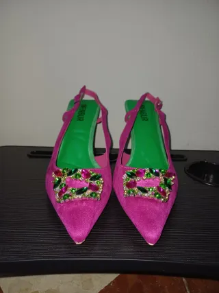 Nuevos sin estrenar! Zapatos de fiesta color morados con brillo que cambian de color según les de la luz. Pueden ser morados o fucsia. Tela de raso. Tacón bajo color dorado. Talla 38. Marca Pilar Burgos. Precio en tiendas 39.99 euros. Elegantes zapatos de fiesta con un diseño único. Detalle de fruncido en toda la superficie. Tira fina para sujetar al tobillo. Tacón fino y estilizado. 🚨VISITA MI OTRO PERFIL TODO PARA MUJER Y HOMBRE CON MÁS DE 170 VALORACIONES. PREGUNTA SIN COMPROMISO🚨