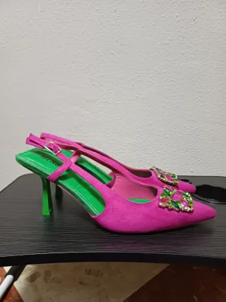 Zapatos de fiesta de la marca Menbur. Talla 41. Usados solo una vez, para una boda. - Adorno de pedrería en la pala con detalles en rosa y verde. - Diseño de punta fina. - Correa de tobillo ajustable. Incluye tapas de repuesto para los tacones.