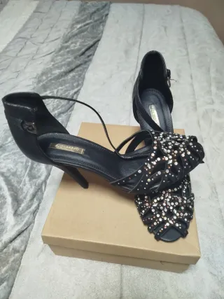 Elegantes zapatos de tacón alto con un diseño brillante. Perfectos para ocasiones especiales. - Tiras adornadas con pedrería. - Tacón fino y estilizado. - Acabado metalizado. -Lo vendo porque me quedan pequeños.