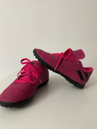 Zapatillas de fútbol Adidas Nemeziz. - Diseño con rayas. - Cordones rosas.