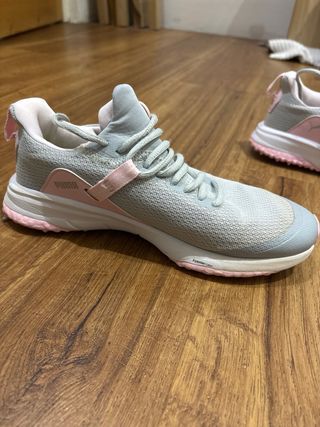 Zapatos de golf de la marca Puma en talla 37. Combinan tonos grises y detalles en rosa. - Diseño deportivo. - Cierre con cordones. - Suela con agarre.