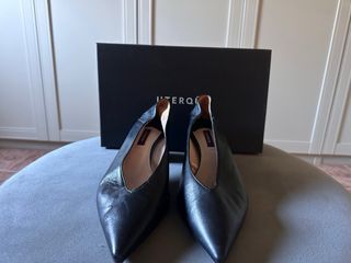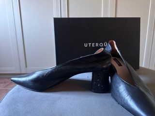 Elegantes zapatos de salón de la marca Uterqüe, la que fue marca de lujo de Zara . Modelo Icónico. Piel de alta calidad. - Diseño de punta afilada. - Corte en V pronunciado. - Acabado liso. - Piel del Talon blanda para que puedas destalonarlos.
