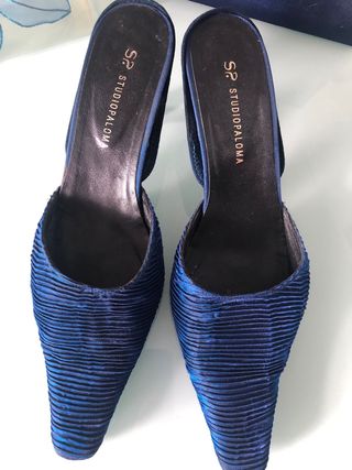 Sandalia morada tacón, de ante, número 37, foto con medida de tacón, con brillantitos y cierre de cremallera. Puesta solo una vez, practicamente nuevas, viene con su caja, precio original 75€. El ante del zapato izquierdo tiene un poco marca de la pisada, pero puesto no se nota.