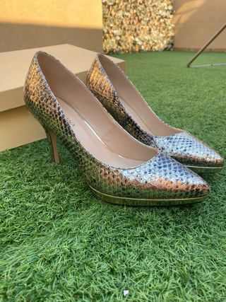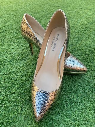 Preciosos zapatos de salón de la marca PACOMENA. Son de color dorado y con un diseño de estampado de serpiente. Se encuentran en muy buen estado. - Tacón de 9cm - Punta fina.