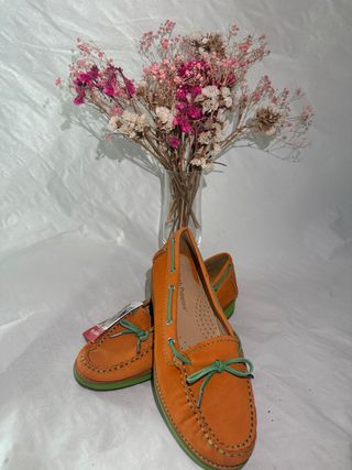 Estos zapatos de la marca Hush Puppies presentan un llamativo diseño en tonos naranja y verde. - Detalle de cordones en verde. - Suela de goma. - Diseño tipo mocasín.