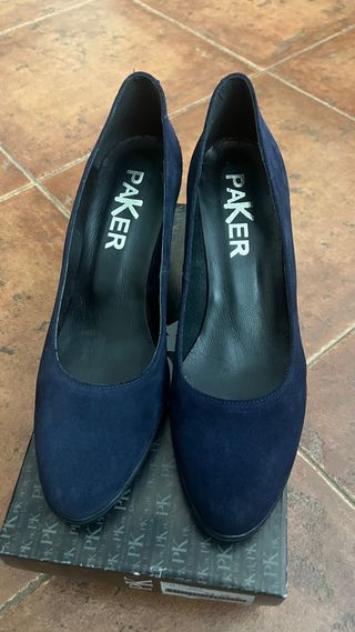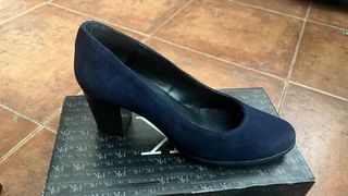 Elegantes zapatos de tacón de ante azul marino oscuro. - Tacón grueso y cómodo. - Diseño clásico y versátil. - Interior con logo de la marca. -Usados solo un día tallan un poco grandes