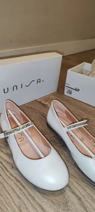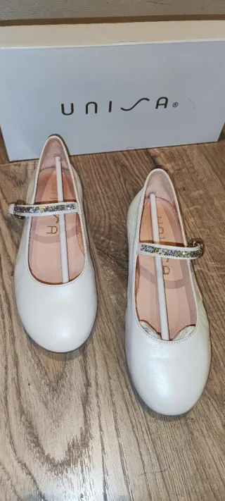 Elegantes zapatos Unisa para niña, talla 36, perfectos para ceremonias. - Color blanco nacarado. Zapatos Merceditas Unisa Niña Ceremonia Piel Blanco Perla (Talla 36) Descripción: Preciosas merceditas de niña de la reconocida marca Unisa, ideales para eventos especiales como bautizos, bodas o comuniones. Características: Confeccionadas en piel blanco perlado o nacarado y adornadas con una elegante pulsera de brillantes de strass. Estado: Segunda mano, puestas solo en dos ocasiones, por lo que están prácticamente nuevas. ¡Perfectas para un look de princesa!