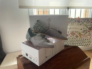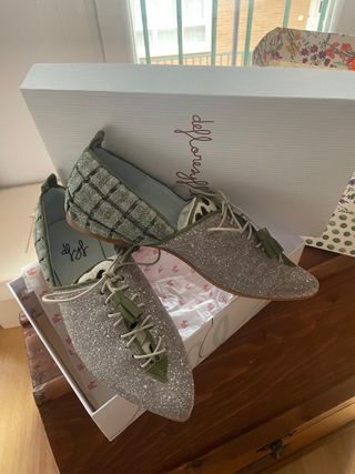 A ESTRENAR Zapatos de punta con brillos Incorporan suela especial térmica, pensada para que el pie no pase frío Marca: Defloresyfloreros - Diseño con brillos plateados. - Detalle de cuadros en el talón. - Adorno de cordones y flecos.