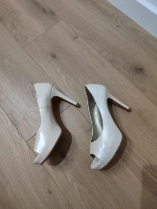 Elegantes zapatos de tacón en color blanco roto,perfectos para un día especial. Solo los usé en mi boda pero les di bastante batalla. Algún rocecito tienen de ahi su precio. La verdad que hacen una pierna preciosa. - Diseño clásico y atemporal. - Acabado satinado. - Marca visible en la plantilla.