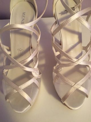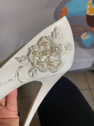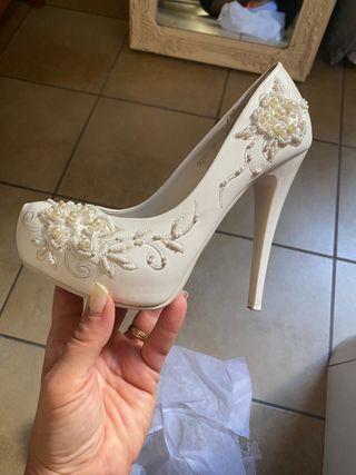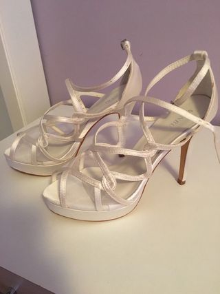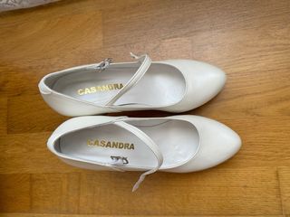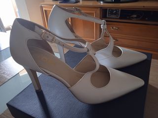 zapatos novia, marca ángel Alarcón( talla 38). Color blanco roto.Exteriormente están en buen estado como se puede ver en las fotos.Se adjunta desperfecto en las fotos que es que la plantilla se ve un poco el pegamento. el tono interior está algo amarillento, porque estaba guardado desde el año 2010.