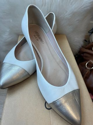 Zapatos de cuero Uniqueshoses de excelente calidad por si no se conoce la marca.Color blanco con puntera dorado suave.Usados una vez. talla 39 altura 2cm Perfectos para cualquier outfit o para un cambio de zapatos de novia para darlo todo en tu dia.
