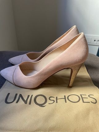 Preciosos stilettos de la marca Uniqshoes, en color rosa nude y talla 38. Son de un material suave y elegante. tacon 10cm con purpurina dorada - Tacón fino y elegante. - Punta afilada. - Perfectos para ocasiones especiales.
