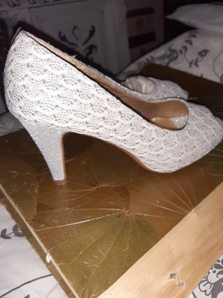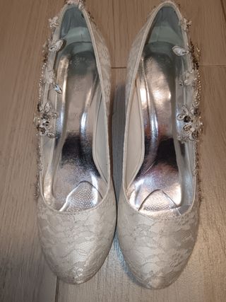 Preciosos zapatos de novia, color blanco roto, con encaje y tacón bajo, muy comodos.