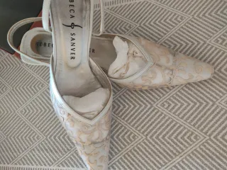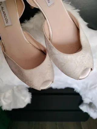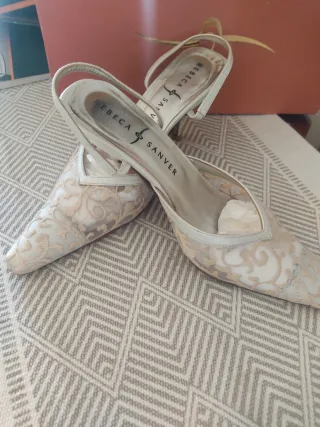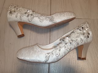 Elegantes zapatos de novia, talla 36/37. Perfectos para tu gran día.Solo usado una vez. - Diseño con encaje en la punta. - Tacón de altura media. - Acabado satinado.