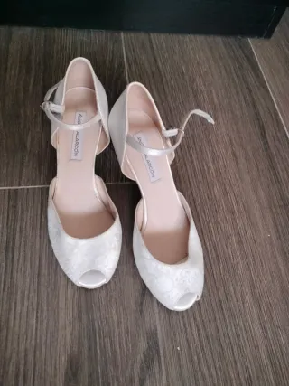 Preciosos zapatos de novia de la marca Doriani, talla 38. Están prácticamente nuevos, solo usados una vez. Son de color blanco roto y de encaje. - Diseño elegante y delicado. - Tacón alto. - Perfectos para un día especial.
