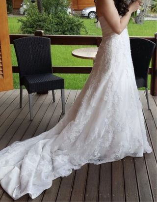 Vestido de novia elegante, sin estrenar. - Diseño con encaje en la espalda. - Cierre de botones en la parte trasera. - Corte sirena. - Abierto con encaje en los laterales. - Fular de seda a conjunto. - No usado por cancelación de boda. -Se pueden incluir zapatos sin usar.
