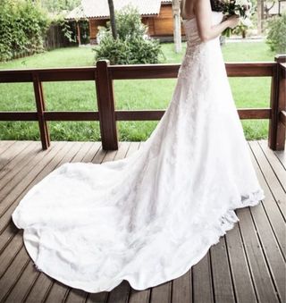 Elegante vestido de novia con detalles de encaje y cola que da preciosidad. Comprado en Atelier Novias total de 835 (en rebaja), Precio original 2000 - Diseño con espalda descubierta. - Falda larga con cola. - Adornado con delicados bordados. - Regalo zapatos (en perfectas condiciones talla 39)