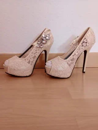 📝 Preciosos tacones de encaje con pedreria, sirven tanto para novia como fiesta. Están nuevos pero de estar guardados en la zona del tacón se han quedado un poquito amarillentos. Tienen plataforma que mide 3cm y el tacón mide 13cm. Aún que pone que es una talla 37 dan más para una 36. 📦 Envío en menos de 24h ❌NO LEER❌ Zapatos Zapatillas Tacón fiesta boda novia drag Queen altos plataforma encaje beige pedrería eventos comuniones comunión bautizo peep toe nochebuena evento elegante casual tacones alto invierno urban casual elegante moda moderno bonito estilo estiloso navidad nochevieja cena de empresa año nuevo reyes regalo