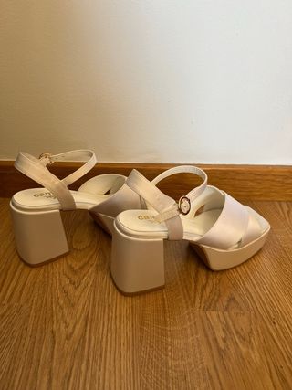 Zapatos de novia , marca doriani. Muy cómodos, tacón de 8 cms y 2 cms de plataforma, son de piel. Los he estado usando por casa para acostumbrarme a ellos, pero me enamore de otros. ( De eso lo negrillo de la suela. Pero lo limpio y como nuevos)