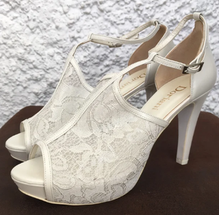 Elegantes zapatos de novia de encaje, perfectos para tu gran día. Han sido usados solo un día. - Diseño peep-toe con detalles de encaje. - Cierre con lazo de satén. - Tacón alto y plataforma.