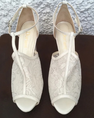 Se venden zapatos de novia (sin estrenar, solo probados en casa) de la marca Doriani. Son de color blanco nacarado/perlado, con diseño peep-toe. Llevan correa ajustable al tobillo y tienen un poquito de plataforma