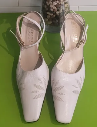 Elegantes zapatos de piel con un diseño de zapatos estilo estileto, tacon y tiras al tobillo de la marca Zubiri Otazua. - Piel blanca. - Hermosos estiletos blancos utilizados en mi propia boda sólo una vez. - Cómodos y atemporales. - Elegantes zapatos de piel genuina ideales para utilizar como complemento de calzado para el vestido de novia de boda. - Diseño con cortes tipo hoja en la puntera. - Cierre con hebilla. - Marca: Zubiri Otazua. #calzado #calzadodemujer #calzadocómodo #calzadodefiesta #zapatos #zapatosmujer #zapatosdeboda #boda #estiletos #zapatosestiletos #