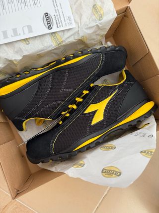 Zapatos de seguridad Diadora Utility. - Diseño en malla transpirable. - Detalles en color amarillo. - Cierre con cordones. Talla 44 ,nuevos a estrenar .