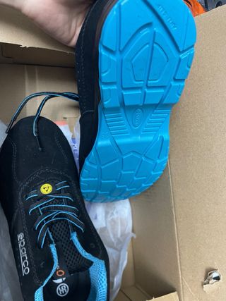 Zapatos de seguridad Sparco con un diseño moderno y funcional. - Combinación de colores negro y azul. - Materiales resistentes para protección. - Usadas una vez - Modelo 0752643NRAZ
