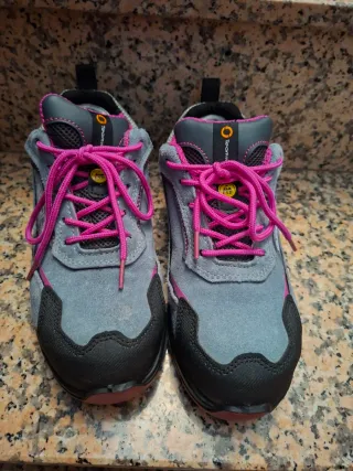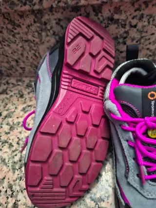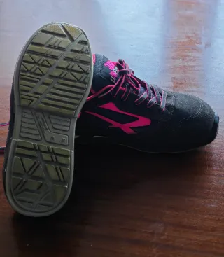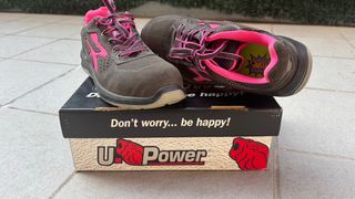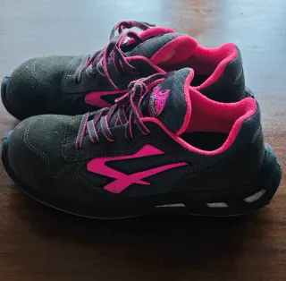 Zapatos de seguridad U-Power, talla 38, en color gris con detalles en rosa. Han sido usados una sola vez. - Diseño moderno y funcional. - Combinación de colores llamativa.