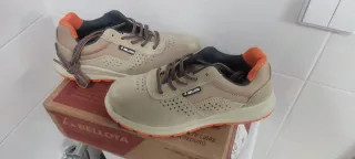 Zapatos de seguridad Bellota en color beige y naranja. Sin estrenar - Talla 39. - Marca Bellota. - Diseño con perforaciones.