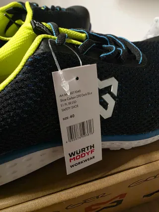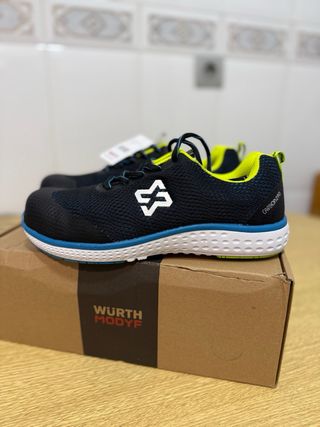 Zapatos de seguridad nuevos, talla 40. - Color principal: negro con detalles en azul. - Marca: Wurth Modyf. - Cumplen la norma EN ISO 20345:2022.