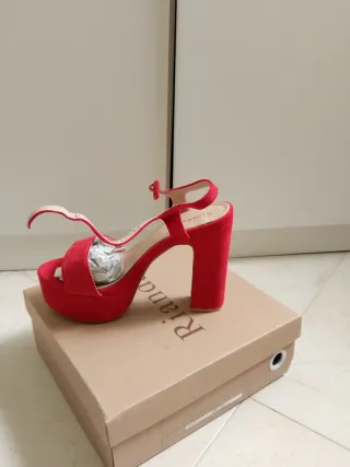 Elegante zapato de tacón alto en color rojo. - Material exterior tipo ante. - Tira al tobillo para un ajuste seguro. - Tacón grueso y plataforma delantera.