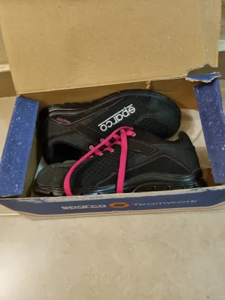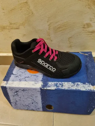 Zapatos de seguridad Sparco, nuevos a estrenar. Combinan un diseño moderno con protección. - Color negro con detalles en rosa. - Suela antideslizante.