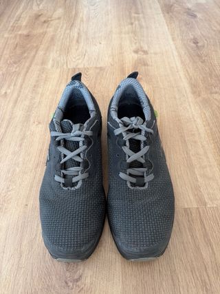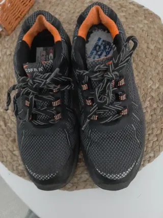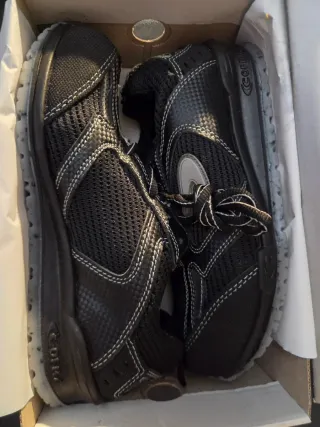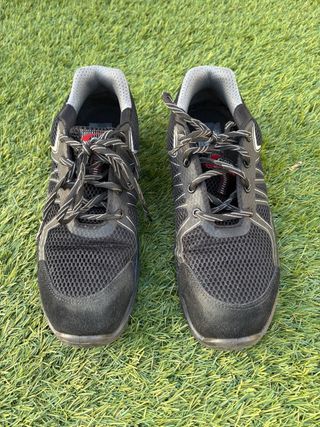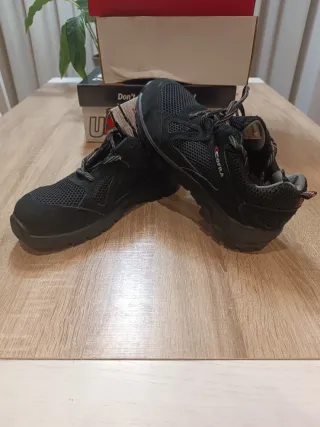 Zapatos de seguridad con un diseño moderno y funcional. - Material exterior de malla transpirable. - Refuerzos en la puntera y laterales. - Cordones de ajuste. - Suela resistente. Usadas en una ocasión.