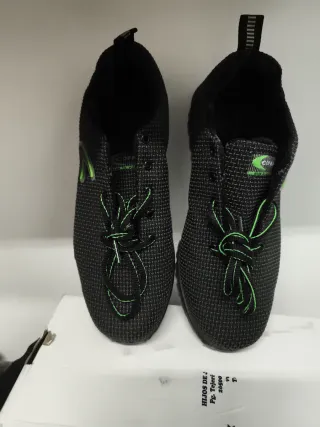 Calzado de seguridad tipo tenis pero con refuerL de seguridad. - Exterior de malla transpirable. - Cordones de ajuste en color verde. - Suela de goma resistente. - Detalle de logo en el lateral.