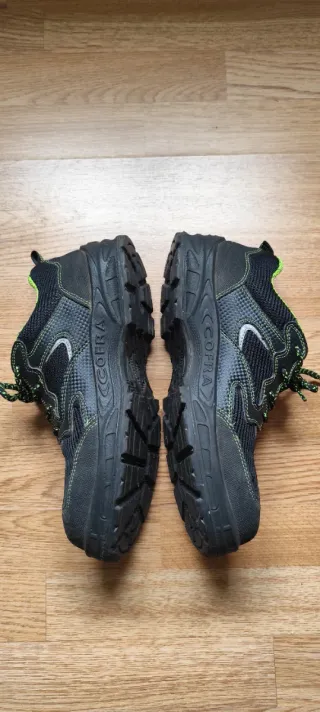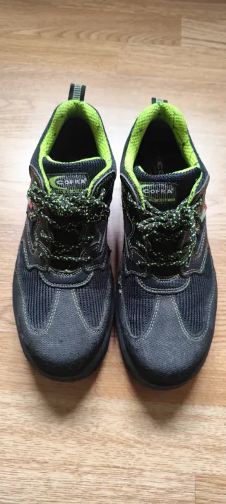 Calzado de seguridad COFRA en talla 42. Diseñados para ofrecer protección y comodidad. - Exterior de malla transpirable. - Cierre con cordones. - Precio en Leroy Merlín es de 78€, en la última foto lo demuestro. - En perfecto estado. - Color negro con detalles en verde.