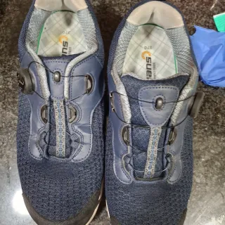 Zapatos de seguridad de la marca SUEH en color azul y negro. Diseñados para ofrecer comodidad y protección. - Suela con diseño antideslizante. - Logotipo de la marca en la plantilla. - Material exterior de malla transpirable.. se abrocha con las dos circulos y se afrojan igual. Sin cordones