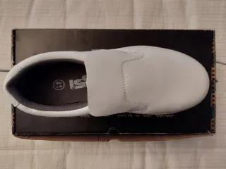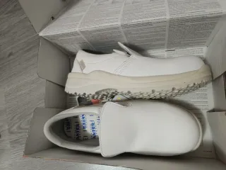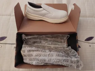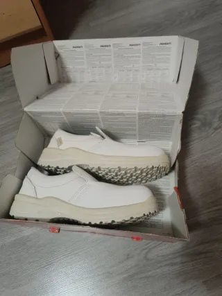 Calzado de trabajo especialmente reforzado para una mayor protección. Zapatos de seguridad con suela antideslizante. Rápidos de poner y quitar, de los que son necesarios para sectores como la hostelería. Tengo dos pares. A 20 € cada uno. Están nuevos y, como tal, vienen en su caja correspondiente.