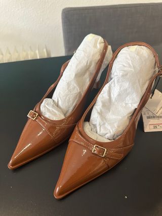 Elegantes zapatos de tacón con un diseño moderno y sofisticado. - Acabado brillante tipo charol. - Detalle de hebilla dorada en la pala. - Correa tipo slingback para un ajuste seguro. - Punta fina y estilizada.