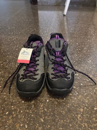 Zapatos de montaña con un diseño deportivo y funcional. - Combinación de colores gris y morado. - Cordones resistentes para un ajuste seguro. - Suela con buen agarre para terrenos irregulares.
